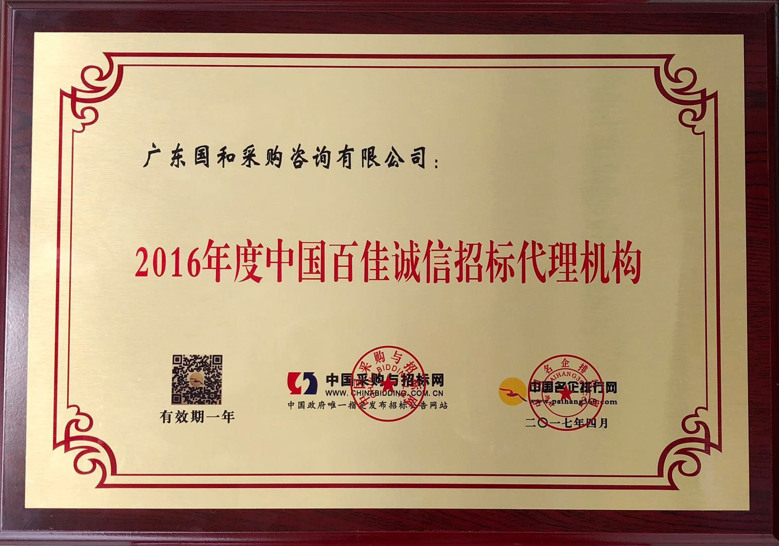 2016年度中國百佳誠信招標(biāo)代理機構(gòu)